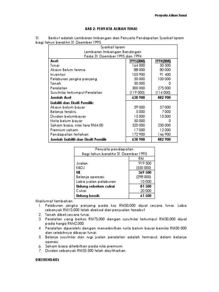 Penyata aliran tunai menunjukkan aliran tunai syarikat, atau wang yang masuk dan keluar dari syarikat dari perbelanjaan, pembelian, jualan, dll. Please copy and paste this embed script to where you want to embed. Video mengenai penyata aliran tunai semester 3 perakaunan stpm. Item aliran tunai pelaburan lain, jumlah. Penyata aliran tunai bab 2 :