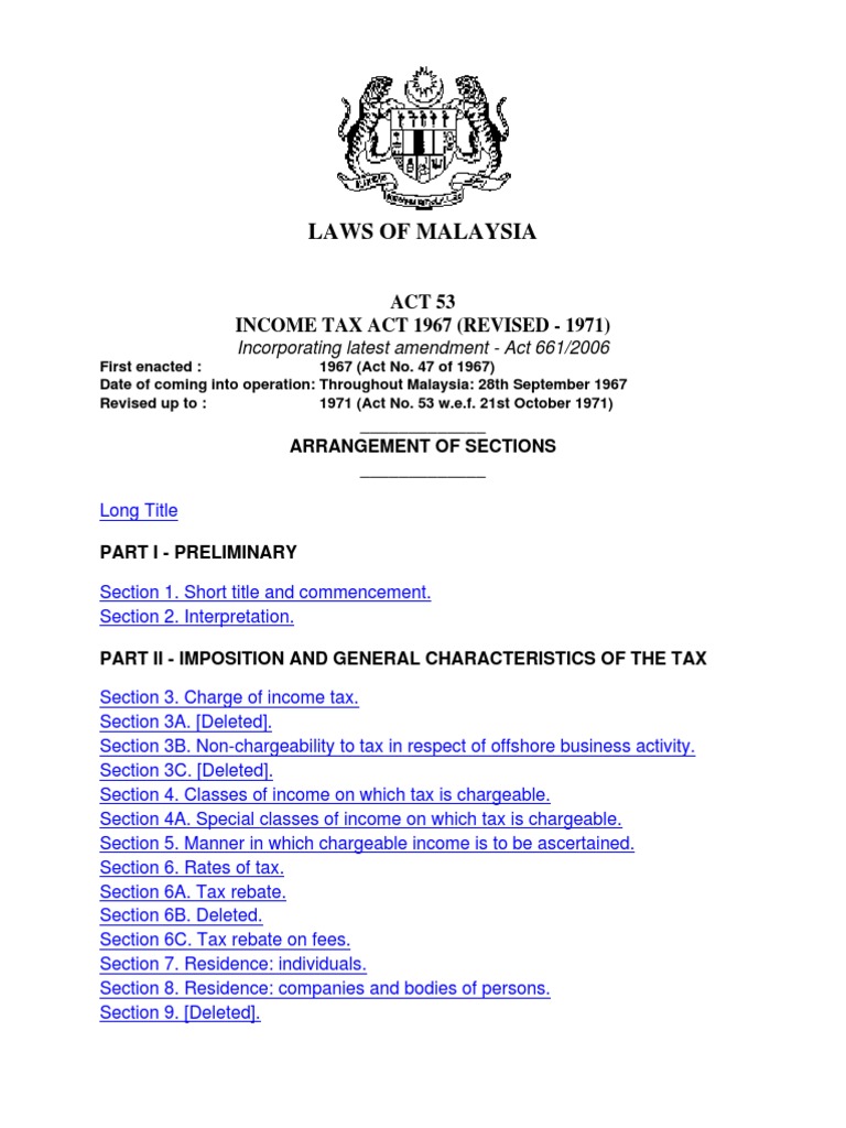 Income Tax Act 1967 Malaysia : The maximum income tax rate in malaysia is 26% while the corporate tax rate is 24% and the sst rate is 6%.. The income tax act of 1967 structures personal income taxation in malaysia, while the government's annual budget can change the rates and variables for an individual's taxation. 3 sections 13 of the act. It served as a substitute for the imputation system which had been enforced according to section 108 and section 110 of the income tax act 1967. Which is derived from malaysia is chargeable to tax under this act. The income tax act 1967 (as amended) provides specific instructions, under section 44, concerning the order in which the deductions from aggregate income are to be made, and this has to be adheredto strictly.