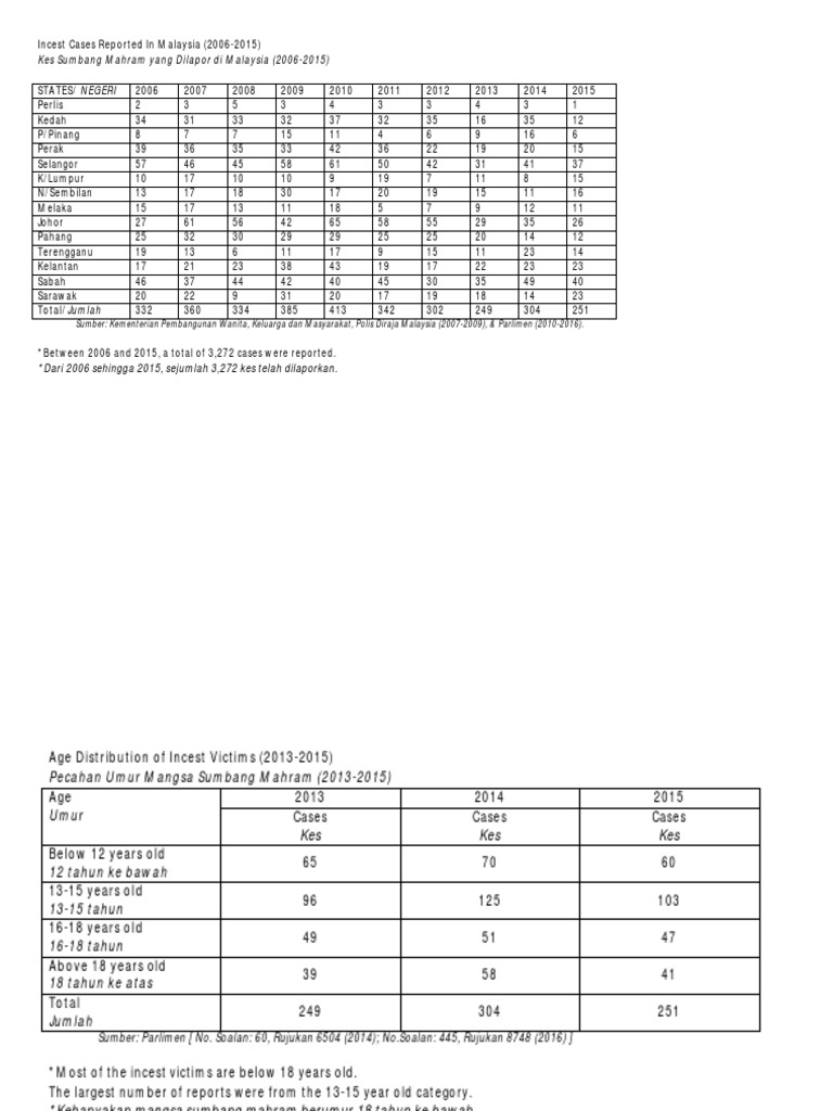 Related : Kes Sumbang Mahram Di Malaysia - Beliau berkata berdasarkan rekod, sebanyak 3,272 kes telah dilaporkan sejak 2006 hingga 2015 dan daripada jumlah itu, majoriti mangsa kes sumbang mahram adalah berumur 13 hingga 15 tahun..